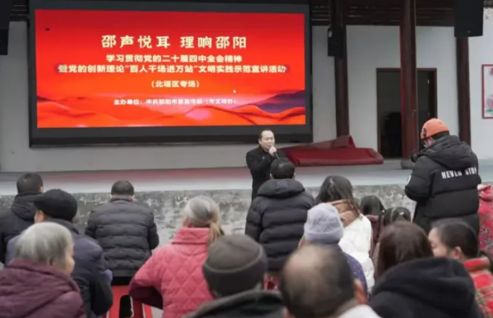 “竹板一打震天響,石廟鄉(xiāng)親聽我講——四中全會放光芒,字字句句指方向!”只見“零零傳說”青年宣講員腕間翻飛,竹板聲聲叩擊,節(jié)奏明快的韻文裹著冬日陽光,直往人心里鉆。在新邵雀塘鎮(zhèn)石廟村的農家院落,人群像潮水般圍攏過來——抱著孩子的婦女、拄著拐杖的老人、剛放下農具的漢子,臉上都映著同樣專注的光。這不是文藝演出,卻比演出更抓人。